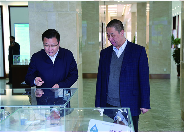 甘南州副州長、合作市委書記劉永革(左)在集團董事長敏文祥(右)的陪同下視察華羚公司