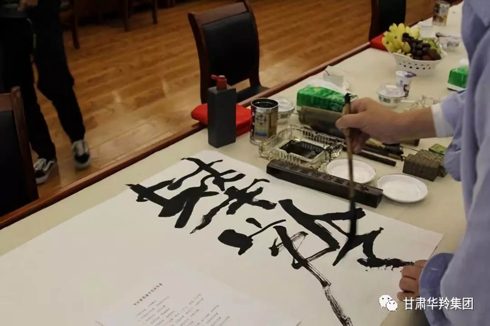 在華羚乳品公司四樓會議接待室,梅凱副院長,周明安委員,常銘主席等著名書畫家現場揮毫潑墨,場面熱鬧非凡,其樂融融。