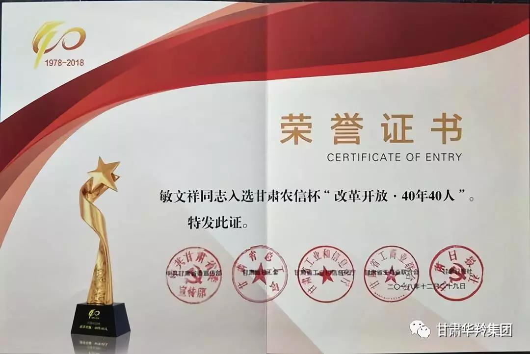2018年12月29日,甘肅省改革開放•40年40人表彰儀式在甘肅省大劇院隆重舉行,甘肅華羚實(shí)業(yè)集團(tuán)董事長敏文祥等40人受到表彰,被授予“改革開放•40年40人”榮譽(yù)稱號(hào)。甘肅華羚實(shí)業(yè)集團(tuán)董事長是甘南州唯一獲此殊榮者。