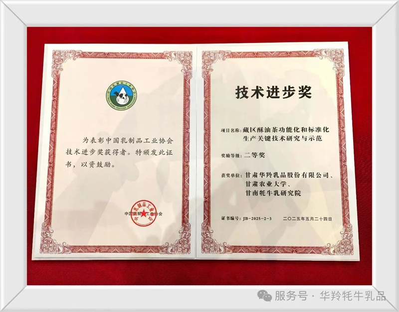 年會的議程當中,2025年度中國乳業科技系列獎項的頒發備受矚目。其中,甘肅華羚乳品股份有限公司研發的《藏區酥油茶功能化和標準化生產關鍵技術研究與示范》項目,榮獲技術進步二等獎,展現出企業在研發創新領域的卓越實力。該項目作為甘肅省科技重點研發計劃項目,凝聚著企業對傳統藏區特色食品現代化轉型的深度思考與持續探索。